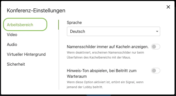 Unter »Arbeitsbereich« finden Sie die Spracheinstellungen und die Optionen zum Anzeigen der Namen auf den Videokacheln der Teilnehmer:innen, sowie die Möglichkeit zum Aktivieren des Hinweistons.