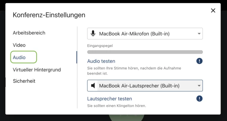 Unter »Audio« finden Sie die Optionen zur Auswahl des Mikrofons/der Eingabequelle und des Lautsprechers/der Ausgabe. Hier können Sie auch die Ein-/Ausgabegeräte testen.
