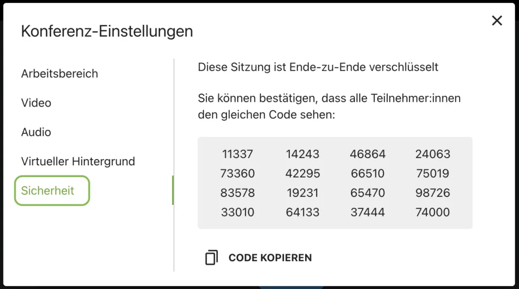 Unter »Sicherheit« finden Sie einen Code, den Sie zur zusätzlichen Absicherung mit allen Teilnehmer:innen in der Sitzung abgleichen können.