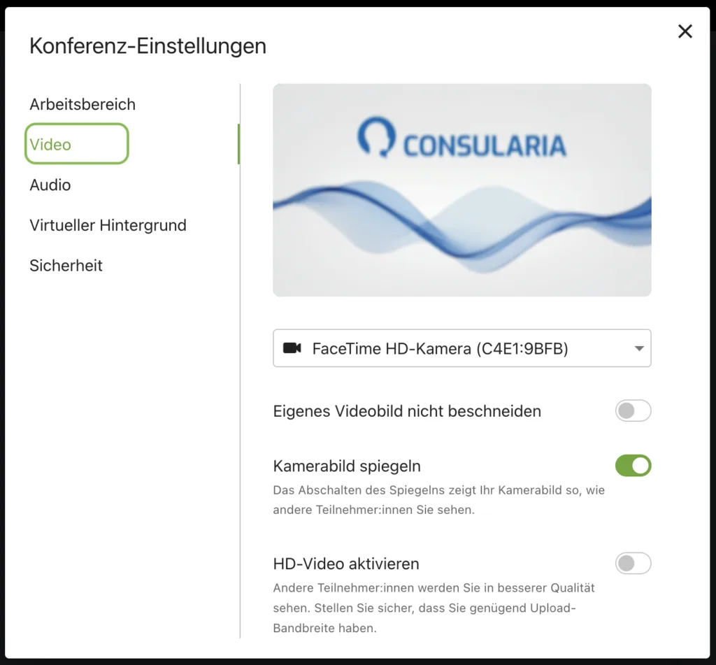 Unter »Video« können Sie die entsprechende Quelle für das Kamerabild wählen. Sie können ebenfalls auswählen, ob Ihr eigenes Videobild in Ihrer Ansicht gespiegelt dargestellt werden soll.