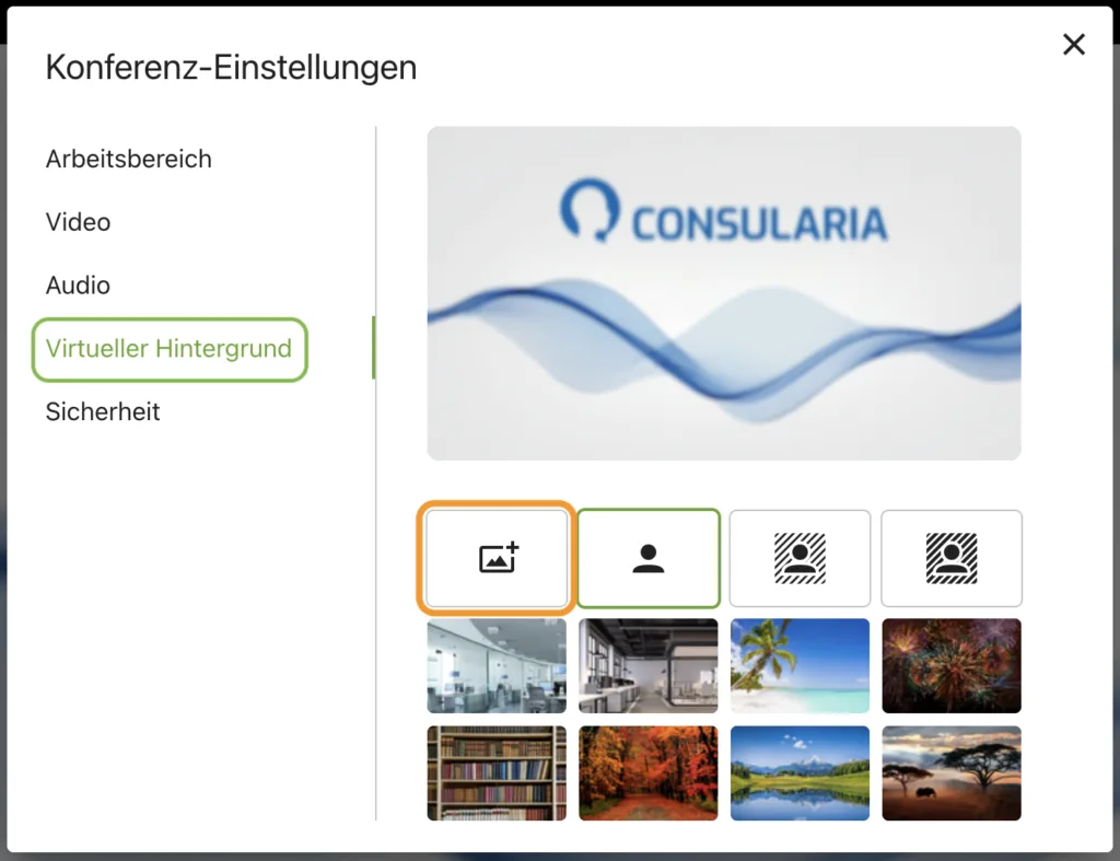 Unter »Virtueller Hintergrund« können Sie die Hintergrundweichzeichnung einschalten oder einen der virtuellen Hintergründe wählen. Wenn Sie auf die obere linke Kachel in der Hintergrundauswahl klicken, können Sie auch ein eigenes Hintergrundbild hochladen. Bitte beachten Sie, dass hochgeladene Hintergrundbilder aus Datenschutzgründen nicht über die Sitzung hinaus gespeichert werden können.