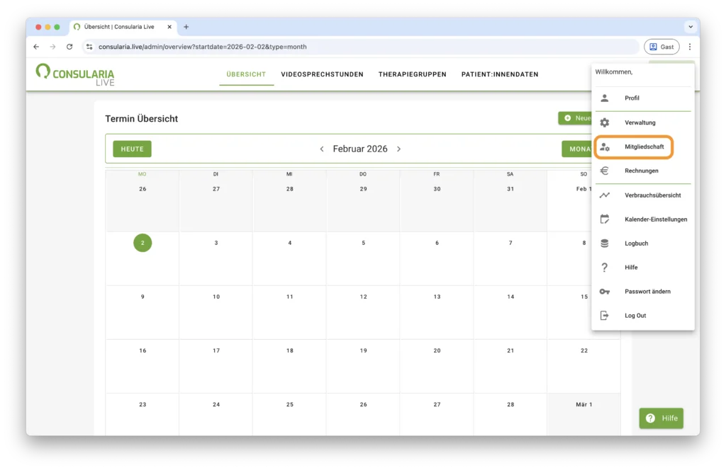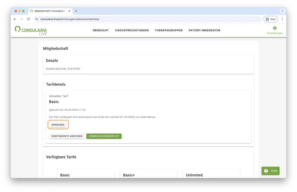 Um eine zahlungspflichtige Mitgliedschaft zu beenden, nutzen Sie einfach die Mitgliedschaft-Verwaltung in Ihrem Consularia Profil. Dort können Sie mit Ihren bestehenden Tarif zur nächsten Abrechnungsperiode kündigen und wechseln automatisch in den Inaktiv-Tarif, in dem z. B. Ihre Patient:innendaten erhalten bleiben. Sie können so zu einem späteren Zeitpunkt reibungslos wieder einen passenden Tarif buchen und wieder Videosprechstunden durchführen.