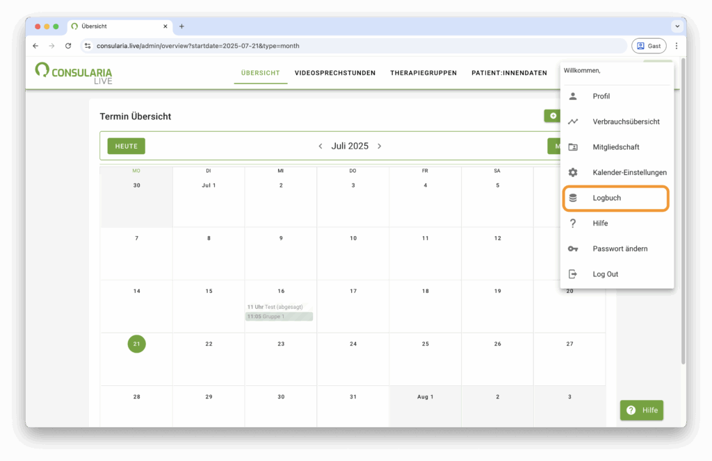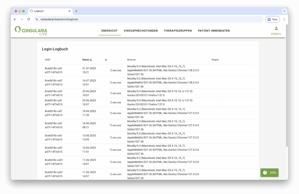 Aus Sicherheitsgründen können Sie unter dem Menüpunkt »Logbuch« die Logins Ihres Accounts der letzten 90 Tage einsehen. Sie finden dort Datum und Uhrzeit des Zugriffs, die anonymisierte IP-Adresse, technische Angaben des Browsers, sowie die Region der IP-Adresse.