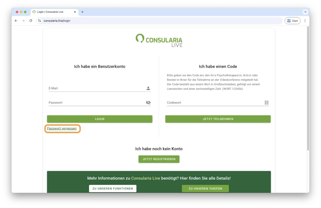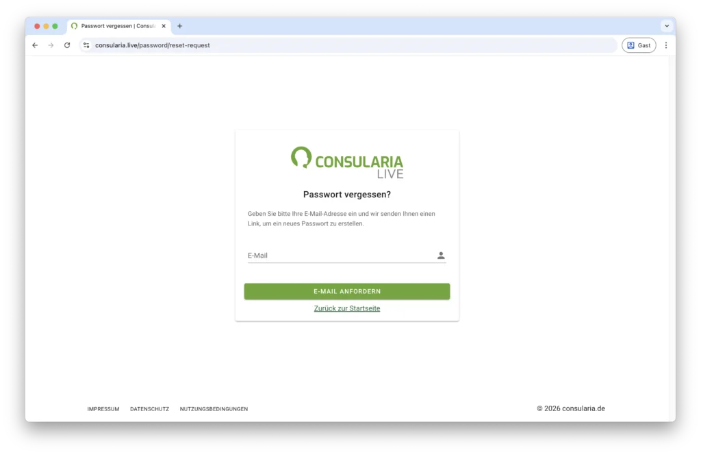 Wenn Sie Ihr Passwort vergessen haben, können Sie sich auf unserer Login-Seite über »Passwort vergessen« ein neues Passwort zuweisen. Klicken Sie dafür unter dem Login-Button auf »Passwort vergessen«, geben Sie auf der sich öffnenden Seite die E-Mail-Adresse Ihres Zugangs ein und klicken Sie auf »E-Mail anfordern«.