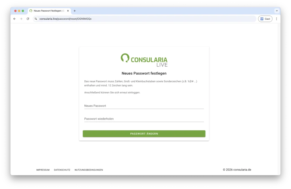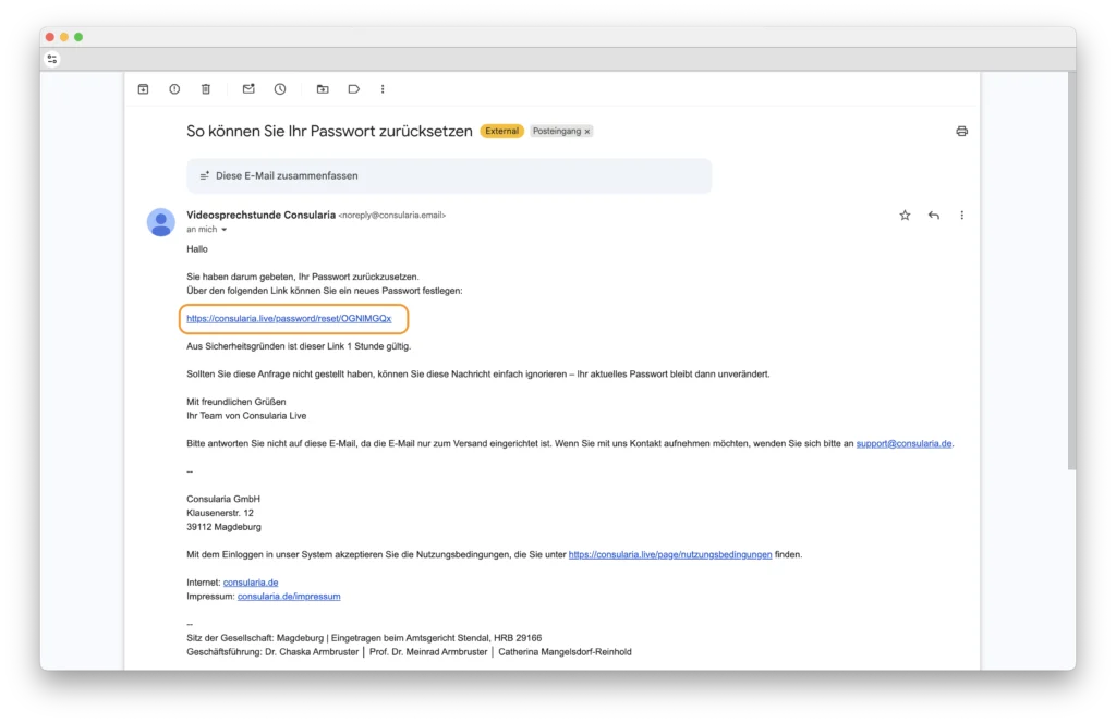Sie erhalten anschließend eine E-Mail von unserem System. Klicken Sie hier auf den Link oder kopieren Sie diesen in die Adresszeile Ihres Browsers. Vergeben Sie anschließend ein neues Passwort, mit dem Sie sich in Zukunft anmelden können.