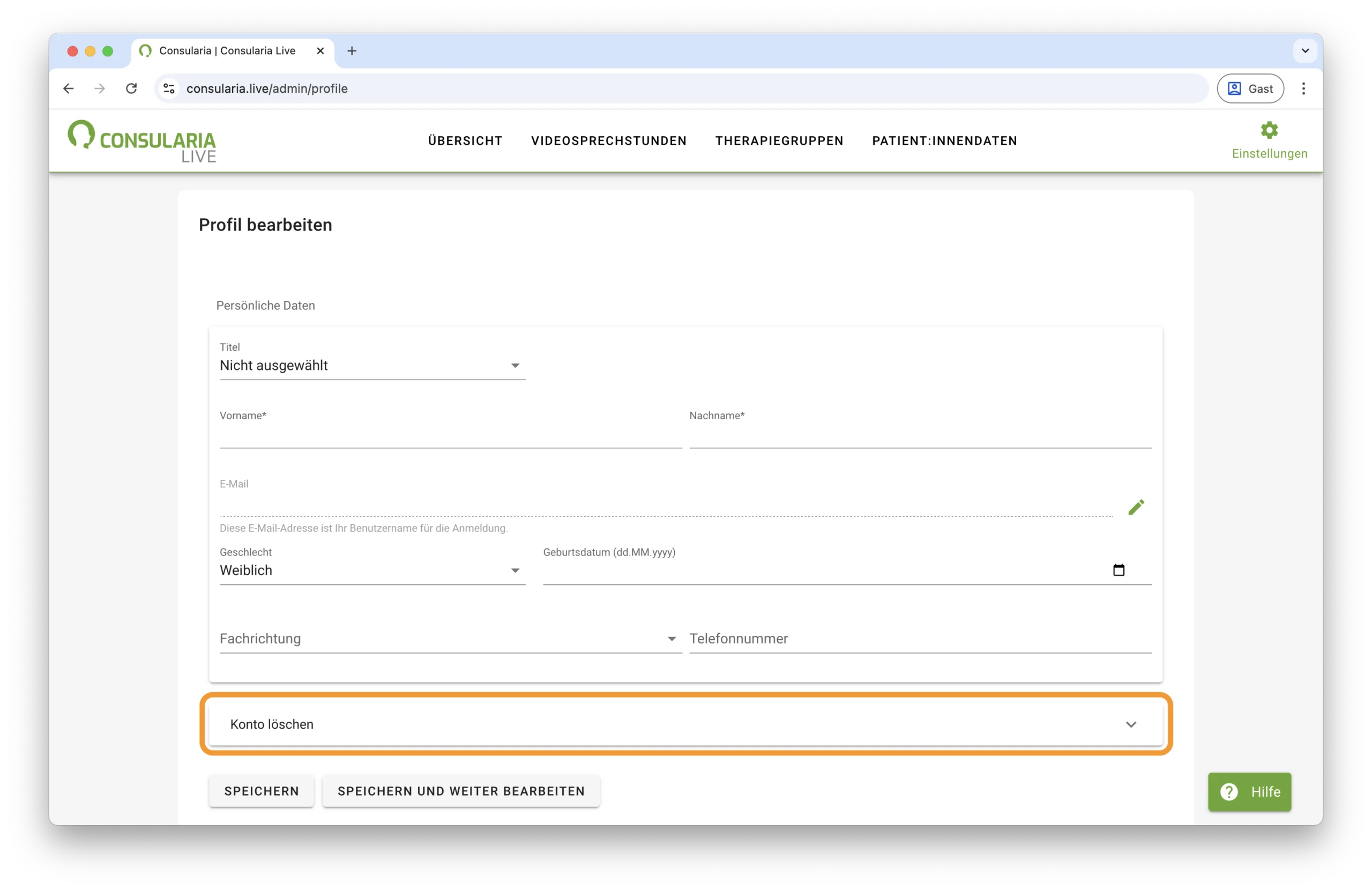 Um Ihren Zugang zu löschen, gehen Sie oben rechts über »Einstellungen« – »Profil« in Ihre Konto-Optionen. Dort finden Sie den Bereich »Konto löschen«.