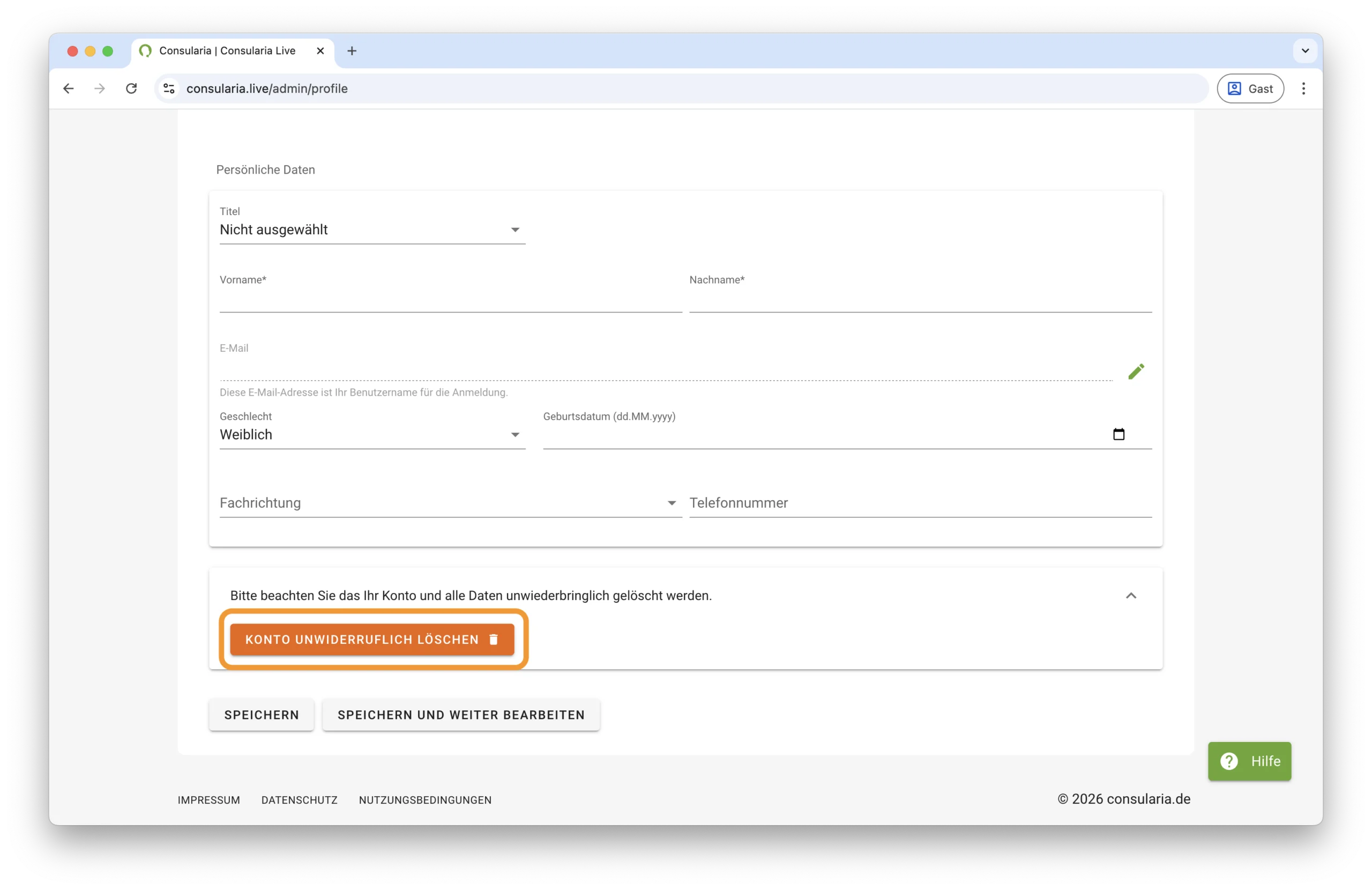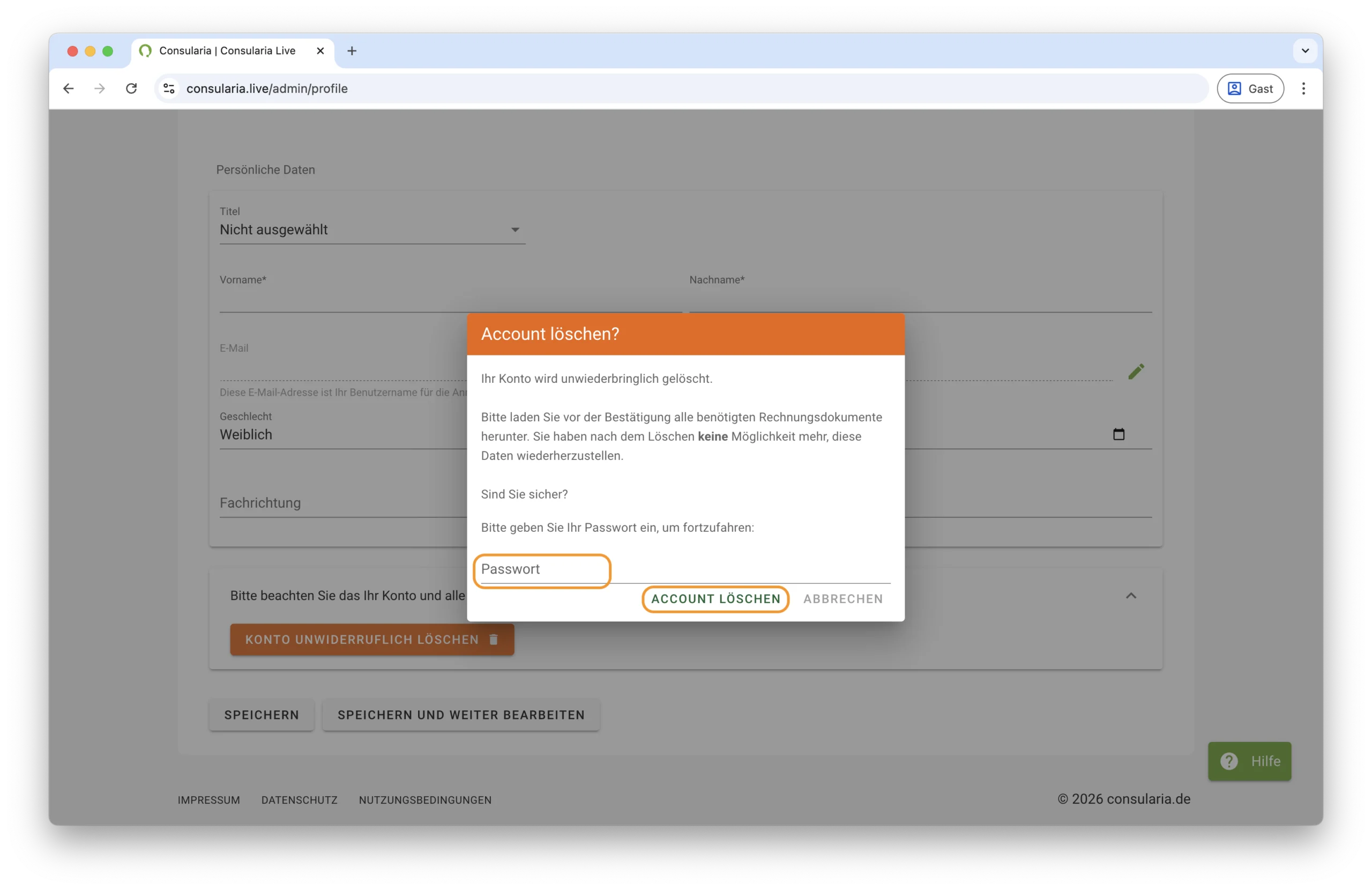 Klicken Sie in dem sich öffnenden Bereich auf die Schaltfläche »Konto unwiderruflich löschen« und bestätigen Sie den Vorgang durch Eingeben Ihres Passworts. Beenden Sie den Vorgang durch Klicken auf »Account löschen«. Bitte beachten Sie, dass das Löschen Ihres Zugangs und der dazugehörigen Daten nach diesem Schritt nicht rückgängig gemacht werden kann.