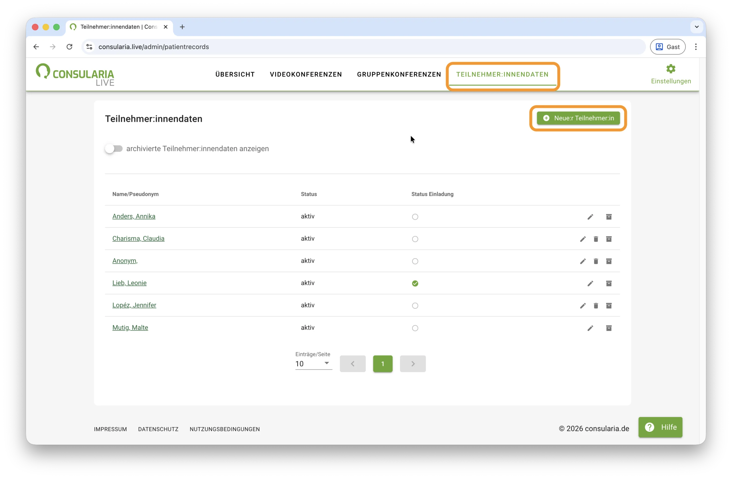 Mit dem letzten Menüpunkt können Sie Ihre Patient:innen einladen, ein eigenes Konto bei Consularia Live anzulegen. Darüber können die Patient:innen ihre Ansprechpersonen sehen und jederzeit alle anstehenden Sprechstunden eigenständig in der Kalenderübersicht einsehen.