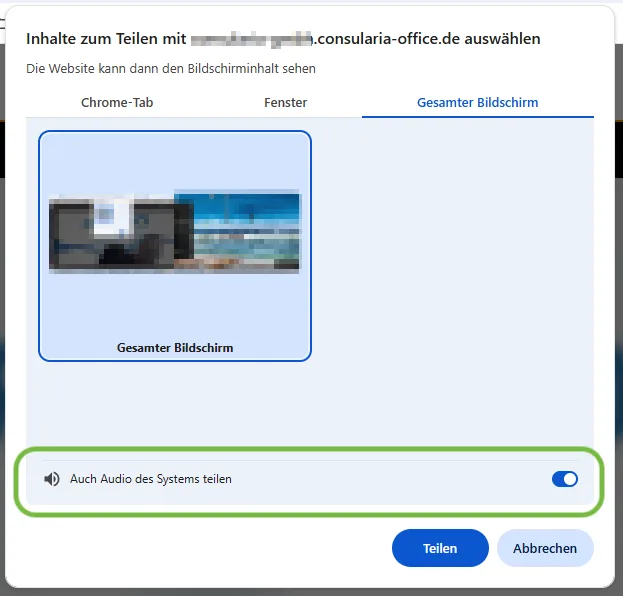 Wählen Sie dann den entsprechenden Tab / das entsprechende Fenster aus, welches Sie teilen möchten, oder wählen Sie »Gesamter Bildschirm«, um diesen entsprechend freizugeben. Wenn Sie bspw. ein Video präsentieren möchten, oder für Teile Ihrer Präsentation auch ein Audiosignal übertragen werden soll, wählen Sie beim Teilen des Tabs unten »Auch Audio des Tabs teilen« aus. Unter Windows können Sie auch beim Teilen des gesamten Bildschirms unten auswählen, dass Ihre Audioausgabe ebenfalls geteilt werden soll.