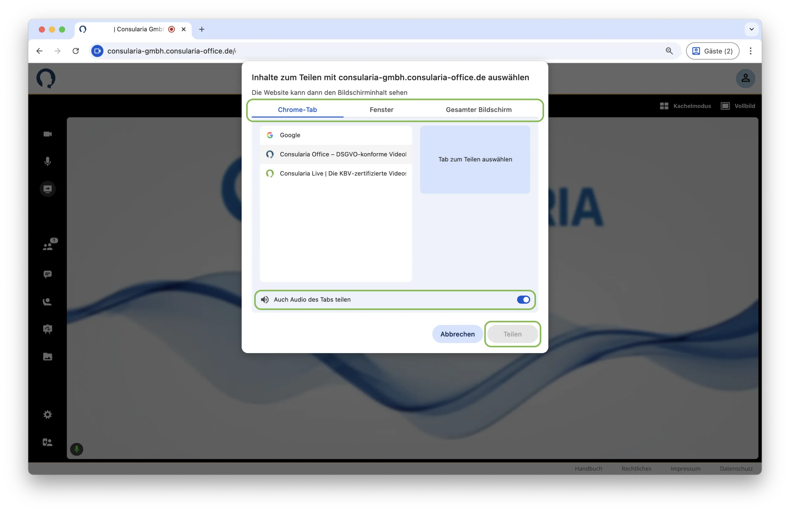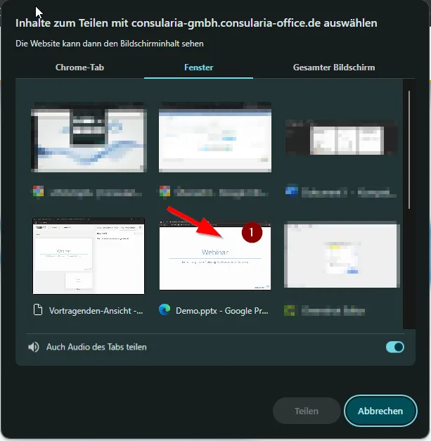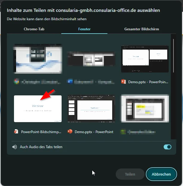 Wählen Sie dann den entsprechenden Tab / das entsprechende Fenster aus, welches Sie teilen möchten, oder wählen Sie »Gesamter Bildschirm«, um diesen entsprechend freizugeben. Wenn Sie bspw. ein Video präsentieren möchten, oder für Teile Ihrer Präsentation auch ein Audiosignal übertragen werden soll, wählen Sie beim Teilen unten »Auch Audio des Tabs teilen« aus.