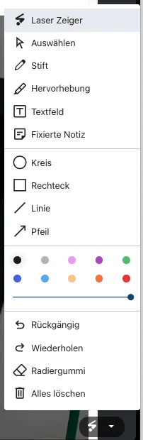 Bei geteiltem Bildschirm finden Sie in der unteren rechten Ecke das Symbol, mit welchem Sie die Zeichenfeld-Optionen öffnen können. Hier finden Sie dann die Laser-Zeiger-Funktion und weitere Zeichenwerkzeuge.