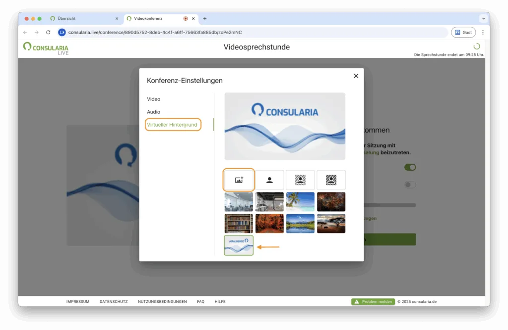 Über die Schaltfläche links unter der Vorschau können Sie auch Ihr eigenes Hintergrundbild hochladen. Wenn Sie ein oder mehrere Hintergrundbilder hochladen, finden Sie diese am Ende der Liste und können dort den entsprechenden Hintergrund auswählen. Bitte beachten Sie, dass hochgeladene Hintergrundbilder bei Verlassen der Sitzung nicht gespeichert werden. Sie müssen diese also bei jedem Beitritt zu einer Sitzung erneut hochladen.